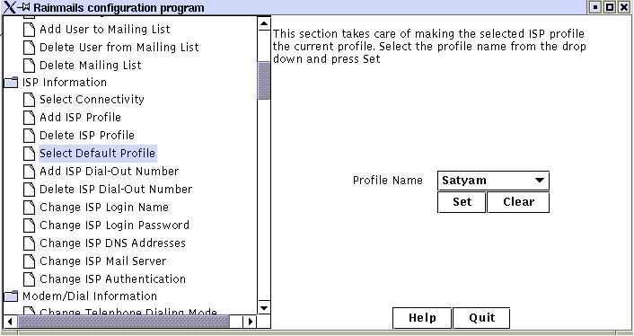 This section explains how to make "Rainmail Server" connect to Internet using a given ISP. Run the configuration program and choose "Select Default Profile" on the left-hand side. That will bring up the following screen: