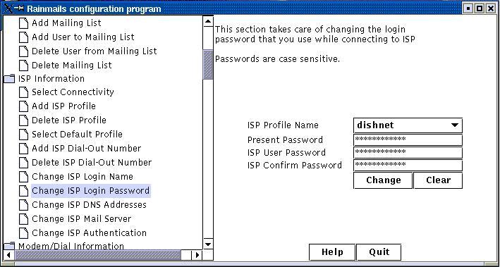 Select the name of the ISP Profile for which you want to change the setting from the Combo box. Enter the current password in the "Present Password" field. Enter the new password twice, once in "ISP User Password" field and once in "ISP Confirm Password" field. Press "Change" button. This new password will be used when "Rainmail Server" connects to your ISP the next time.